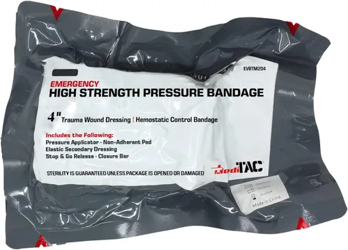 Sellado al vacío doble estéril: el vendaje está en una bolsa interior sellada al vacío que se coloca en un paquete exterior sellado al vacío. Embalaje de bajo perfil: el vendaje es de 4 pulgadas de ancho y 70 pulgadas de largo, sin embargo, su diseño de cubo sellado al vacío ocupa poco espacio para el almacenamiento. Aplicación rápida y fácil: una persona lesionada puede autoaplicar el vendaje con una mano. Diseño todo en uno: consolida lo siguiente: aplicador de presión, almohadilla no adherente, apósito secundario elástico, liberación Stop & Go y barra de cierre.