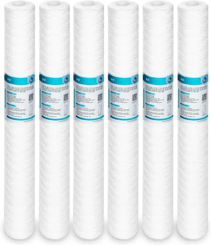 Rendimiento excepcional: en comparación con el cartucho de filtro fundido soplado, el filtro de cuerda es la mejor opción para filtrar agua con mucho sedimento. Cuatro veces la capacidad de retención de suciedad, doble caudal, vida útil más larga que el filtro de sedimentos PP. Dimensiones estándar: el cartucho de filtro universal de cuerda de 20 x 2.5 pulgadas se adapta a la mayoría de carcasas de filtro de 20 pulgadas, como prefiltro de sistemas de ósmosis inversa (RO) y filtración de agua para toda la casa, así como una variedad de sistemas de tratamiento de agua comerciales e industriales. Función: elimina el 99% de partículas, limo, arena, óxido y otras partículas no disueltas en agua sucia. Como la primera línea de defensa en el sistema de filtración, proteja su agua utilizando aparatos y plomería para un agua más clara, mejore la calidad y el sabor del agua. Características: estructura única de panal que aumenta la capacidad de retención de suciedad, el tubo central de material de polipropileno aumenta la resistencia a la presión. Material 100% polipropileno, no tóxico e insípido. Vida útil: para una mejor calidad del agua, se recomienda reemplazar dos o tres veces al año, dependiendo de la calidad de la fuente de agua original y el tipo de aplicación. La presión diferencial de cambio recomendada es de 30 psi(2.1 bar).