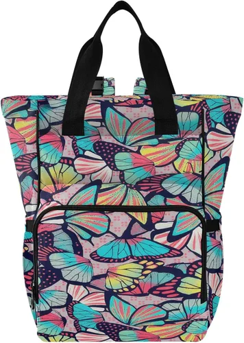 Diseño versátil: funciona como mochila y bolsa de mano con múltiples opciones de transporte, con un sistema de correa para cochecito y funda de equipaje para comodidad de viaje Capacidad de almacenamiento: compartimento principal espacioso de 15 litros con múltiples bolsillos organizadores interiores, además de un bolsillo dedicado para la mamá para artículos personales y bolsillo trasero de fácil acceso Organización de botellas: cuenta con tres soportes aislados para botellas en el compartimento frontal con cremallera, además de bolsillos laterales elásticos con conveniente ranura para dispensador de pañuelos Materiales de alta calidad: fabricado con tela de nailon duradera con correas negras resistentes y cremalleras confiables, diseñadas para el uso diario y durabilidad de viaje Tamaño compacto: mide 11.02 x 5.91 x 15.3 pulgadas, perfecto para llevar artículos esenciales del bebé mientras mantiene un aspecto elegante y organizado con vibrante estampado de mariposa