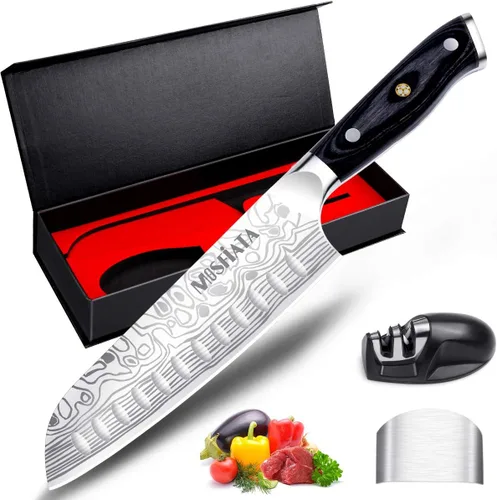 Cuchillo Santoku profesional: este cuchillo de carne Santoku Super Sharp de MOSFiATA está hecho de acero inoxidable alemán de alta calidad que resiste el óxido, la corrosión y la decoloración. Se puede utilizar para tus tareas diarias de cocina de cortar, rebanar, cortar en cubitos y picar todo tipo de carne, verduras, frutas y pan. Es adecuado tanto para cocinas domésticas como para restaurantes. Borde ultra afilado: la nitidez es clave. Pulido a mano por artesanos con décadas de experiencia para garantizar su durabilidad. El grosor de este cuchillo de cocina es de 0.098 in. Su borde pulido a mano es de 14 a 16 grados por lado, que es resistente y afilado para hacer el trabajo perfectamente. Dureza Rockwell: 56 ± 2 HRC. Mango resistente: el sólido mango Micarta minimiza la tensión de la muñeca mientras proporciona un agarre seguro y cómodo sin importar el tamaño de tu mano o dónde agarres. Incluso después de un uso prolongado, tu palma y muñeca no se cansarán. Ideal tanto para las personas que cocinan con frecuencia como para aquellos a los que les gusta preparar bocadillos. La durabilidad y fiabilidad del cuchillo de cocina están aseguradas por el diseño de triple remache que fija el mango firmemente a la hoja. Cuchillo Santoku, protector de dedos, afilador de cuchillos incluido: protege tus dedos y mantén tu cuchillo afilado con los otros tres artículos en la caja. Consejos: Para usar el sacapuntas como muy simple, también puede encontrar algunos tutoriales de video en cualquier sitio de video buscando "Cómo usar un sacapuntas". El regalo perfecto: el cuchillo viene en una caja de regalo negra de alta calidad, por lo que es el regalo perfecto para una madre, padre, abuelo o amigo. Además, con el protector de dedos, los niños pequeños y otros miembros de la familia estarán protegidos mientras cortan. Nota: no es acero de Damasco.