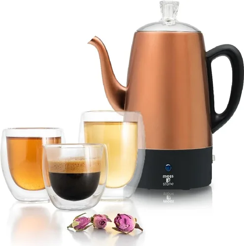 Cafetera Eléctrica Percoladora de Calidad Premium: La percoladora de café clásica prepara de 2 a 10 tazas de café de gran sabor, caliente, rico y sabroso, para que disfrutes tu día. Mantiene tu mano fría: la ventaja de usar tazas de café con una doble pared que no conduce el calor cuando el café o el té interior está caliente. En contraste, la pared exterior permanecerá segura para el contacto con las manos. Esas elegantes tazas de café transparentes darán la ilusión de que el líquido en el interior está flotando en el aire. Taza única de doble pared: Las tazas de café de vidrio de doble pared de Moss and Stone son modernas y de aspecto suave con un aspecto cristalino. Es un diseño de doble pared y una taza de vidrio aislante de borosilicato. Los tamaños de las tazas son de 5 onzas, 8 onzas y 11 onzas, y es un regalo perfecto para todos los amantes del té y el café. Accesorio Perfecto: Nuestra cafetera eléctrica de 10 tazas tiene un filtro de café extraíble, una cesta de filtro y tubo de bombeo, una boquilla fácil de verter. Diseño tradicional para proporcionar un café elegante en cualquier momento sin derrames. Diseño elegante: La cafetera eléctrica de percolador está fabricada en acero inoxidable duradero y brillante con un asa negra de tacto fresco, luz indicadora de "listo para servir" y función automática de mantener caliente para mantener el café caliente.