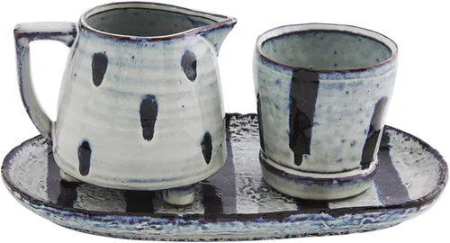 Juego de 3 piezas. La jarra de crema de gres esmaltado reactivo y la olla de azúcar vienen con bandeja.