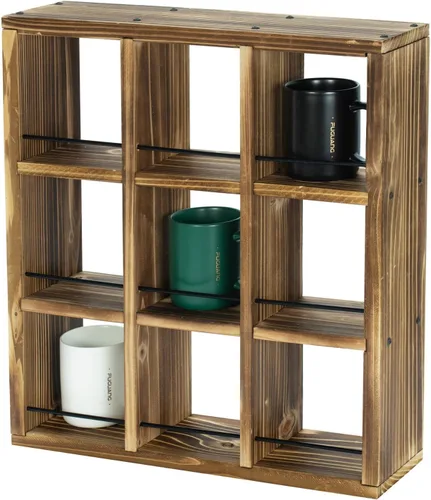 Estante de almacenamiento de tazas de madera quemada maciza rústica con capacidad para hasta 9 tazas, perfecto para tu hogar, cocina, cafetería, cafetería o cafetería El estilo de caja de sombra te permite mostrar cada taza de café, taza de té, vaso de chupito y más en su propio cubículo individual con un riel de metal negro para evitar que se resbalen. **Requiere algo de montaje** La construcción de madera maciza con acabado de madera quemada aportará un toque rústico moderno a cualquier espacio; hecho de madera maciza. El color real y el grano de la madera pueden variar debido a los materiales naturales y el procesamiento del acabado del color Libera espacio en armarios y mostradores con el diseño montado en la pared; se monta fácilmente en la mayoría de superficies de pared planas con el hardware adecuado Dimensiones aproximadas: 18.5 pulgadas de largo x 4.7 pulgadas de ancho x 20.3 pulgadas de alto; cada cubículo - 5.2 pulgadas de largo x 4.3 pulgadas de ancho x 5.8 pulgadas de alto (en pulgadas)