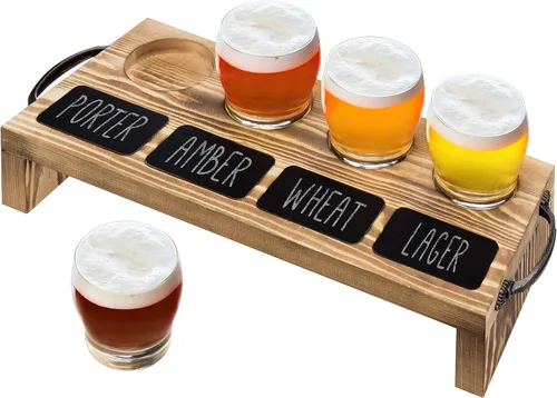 MyGift Juego de regalo de vidrio de cerveza de madera maciza con 4 vasos de cerveza de degustación y bandeja para servir con etiqueta de pizarra