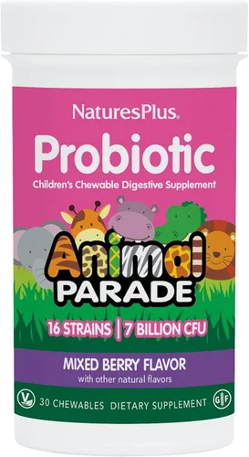 Probiótico para niños: la salud digestiva, especialmente una mezcla saludable de microbios intestinales probióticos "buenos" es esencial para el bienestar general de los niños. Animal Parade Probiotic proporciona niveles ideales y cepas de bacterias beneficiosas. Restaura el equilibrio: la dieta, el estilo de vida y otros factores pueden alterar el equilibrio intestinal, pero la evidencia muestra que los suplementos con especies probióticas clave pueden ayudar a restaurarlo. Estos microbios ofrecen varios beneficios para la salud, incluido el apoyo a la digestión y el metabolismo. Intestino, salud inmunológica y más: un microbioma intestinal saludable también juega un papel clave en la salud inmunológica, crecimiento saludable, función respiratoria, piel radiante, descomposición de alimentos e inhibiendo la colonización por bacterias "no tan amigables". Probiótico masticable de bayas mixtas: Animal Parade es un delicioso masticable de bayas mixtas que a los niños les encantará, con 7 mil millones de bacterias vivas en 16 cepas únicas. Incluye una mezcla probiótica diseñada para estimular el microbioma y un complejo de fibra prebiótica. Vegano y sin gluten: esta fórmula es sin gluten, vegana y certificada sin OMG. Fabricación de calidad: nuestras instalaciones de fabricación de vanguardia mantienen la adherencia continua al cumplimiento de cGMP, estándares superiores y están registradas por la FDA y NSF.