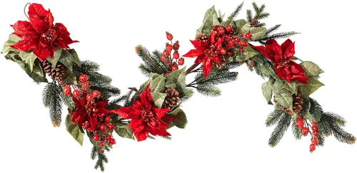 Decora con estilo esta temporada navideña con esta elegante guirnalda de flores de pascua. Son sesenta pulgadas (eso es cinco pies llenos) de encanto navideño, sinuoso y torcido alrededor de tu barandilla, entrada, vigas expuestas o en cualquier otro lugar que se necesite un poco de festividad navideña. Hermosas hojas rojas se asientan sobre una exuberante vegetación y tallos de pino, con bayas falsas y piñas que completan el toque navideño: ¡salud!