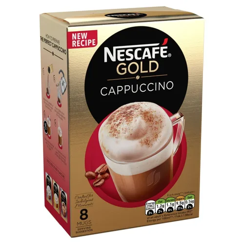 Un capuchino instantáneo estilo cafetería que puedes crear en momentos Nescafe utiliza granos de café tostados naturales de alta calidad. Hecho con ingredientes simples como la leche fresca de los agricultores británicos Láctea y suave con una espuma aterciopelada. Saborea cada momento con ocho bolsitas de capuchino estilo cafetería.