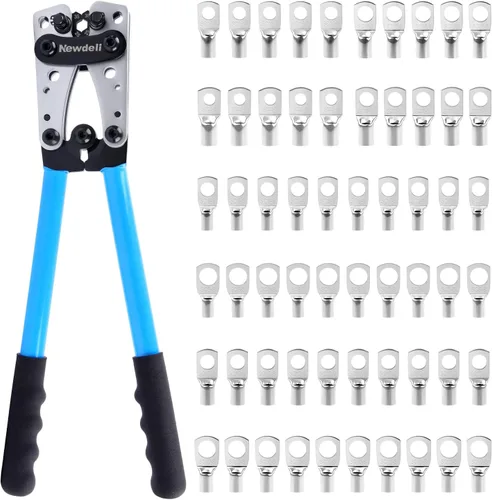 Newdeli Herramienta de prensado de terminales de cable de batería 10-1/0 AWG con 60 terminales de anillo de cobre, juego de terminales de cable de 8