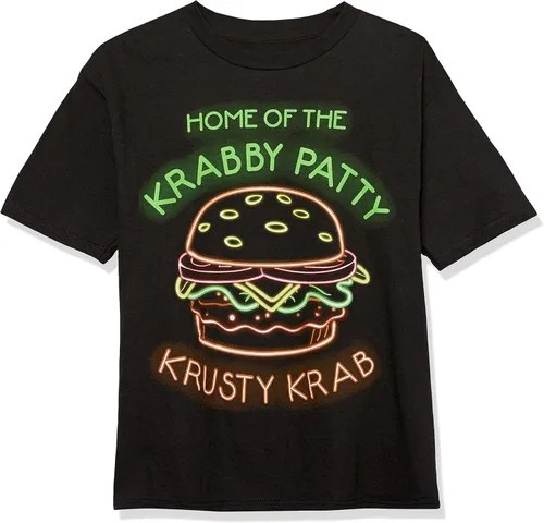 Camiseta con licencia oficial de Nickelodeon Bob Esponja Krabby Patty Neon Sign. Con una serigrafía estilo neón de la famosa Krabby Patty Krabby de Krusty Krabby en una camiseta de algodón suave y negro. Disponible en tallas de niños XS (4/5), S (6), M (7/8), L (10/12), XL (14/16) y XXL (18). Es un gran regalo para los jóvenes fanáticos de Bob Esponja