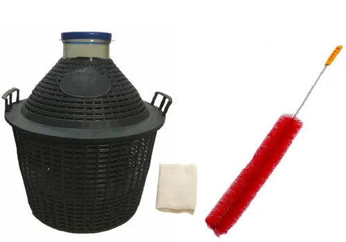 Demijohn de vidrio con cesta de plástico - 34 litros - capacidad 8.99 galones - Hace 8.5 galones de vino Incluye el demijohn de vidrio, cesta de plástico, paño de queso, banda de goma, cepillo de limpieza y tapa. Contenedores de vidrio transparente que son perfectos para cerveza casera, vino, sidra, etc. Recuerde dejar un poco de espacio para el espacio de cabeza durante la fermentación, a aproximadamente 2-3 pulgadas de la parte inferior del tapón. La cesta de plástico rústica duradera protege el Demijohn y permite facilitar el transporte de contenedores completos. NOTA: El vidrio se sopla y burbujear en el vidrio es normal y no se considera defectuoso. El color del cepillo y la tapa puede variar
