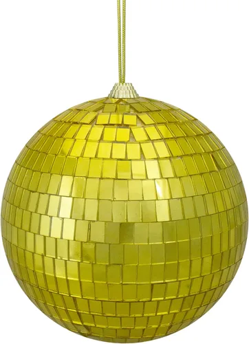 Adorno navideño de bola de discoteca con acabado de espejo dorado La bola viene equipada con una tapa de adorno dorada Recomendado para uso en interiores; solo limpiar las manchas El adorno mide 6 pulgadas de diámetro