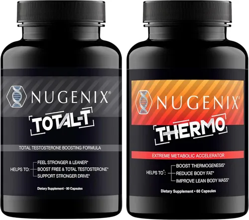 Total-T: Nuestra fórmula única contiene una potente mezcla de ingredientes de alto rendimiento. Con cantidades clínicamente validadas de Tesnor, elevATP y boro. Total-T: Despierta listo para conquistar el día. Total-T contiene el ingrediente clave elevATP, respaldado por 5 estudios clínicos para aumentar la producción de energía de su cuerpo y el rendimiento del ejercicio. Sin nerviosismo ni choque. Termo: Desarrollado científicamente con una mezcla única de ingredientes, nuestro innovador acelerador metabólico ofrece la potencia de aumento de energía y quema de grasa que necesita para lograr sus objetivos de acondicionamiento físico Termo: Junto con la dieta y el ejercicio, nuestro quemador de grasa de vanguardia promueve el metabolismo saludable, apoya los esfuerzos de pérdida de peso, mejora la composición corporal, regula el apetito y aumenta la tasa metabólica en reposo Nugenix está fabricado en los Estados Unidos en nuestras instalaciones cGMP certificadas por NSF ubicadas en Salt Lake City, Utah, utilizando ingredientes de primera calidad cuidadosamente procedentes de los Estados Unidos y de todo el mundo.