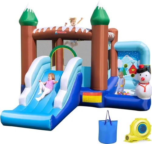 Casa inflable 6 en 1: la casa de rebote OLAKIDS está diseñada con un gran área de rebote, un tobogán, un pozo de bolas, un juego de lanzamiento y lanzamiento de anillo, y un borde de baloncesto para satisfacer diferentes necesidades de entretenimiento. Recomendado para niños de 3 a 10 años. Materiales de calidad para mayor seguridad: esta casa inflable para niños está hecha de tela Oxford 420D resistente a pinchazos y materiales recubiertos de PVC. El área principal de rebote está rodeada de paredes de malla, lo que puede garantizar la seguridad y ventilación de los niños. Los padres también pueden observar a los niños durante el juego. Es adecuado para 2 a 3 niños, peso máximo de 200 libras en total. Montaje sin esfuerzo: esta casa de rebote para niños explota en minutos con un ventilador de 680 W y necesita inflarse continuamente cuando se usa. Fácil de instalar y desmontar, este castillo inflable se puede utilizar en el patio, parque, etc. Disfruta de diversión ilimitada: con un atractivo diseño temático de muñeco de nieve, los niños disfrutarán de horas de felicidad con sus familias y amigos en esta casa de rebote interior, que puede inspirar sus intereses en los deportes y reducir el tiempo de pantalla. Accesorios gratis: Esta casa inflable para niños pequeños viene con una bolsa de transporte para almacenamiento, un kit de reparación para la fijación, un soplador de aire de 680 W para configurar. También se proporcionan 8 estacas para la estabilidad. Cumple con nosotros. Requisitos CPSIA y ASTM: Hecho de material seguro, libre de BPA, PVC, ftalatos, plomo, látex y formaldehído. Sin puntos afilados ni bordes. Pasó las pruebas de estabilidad, asfixia, carga y cizallamiento