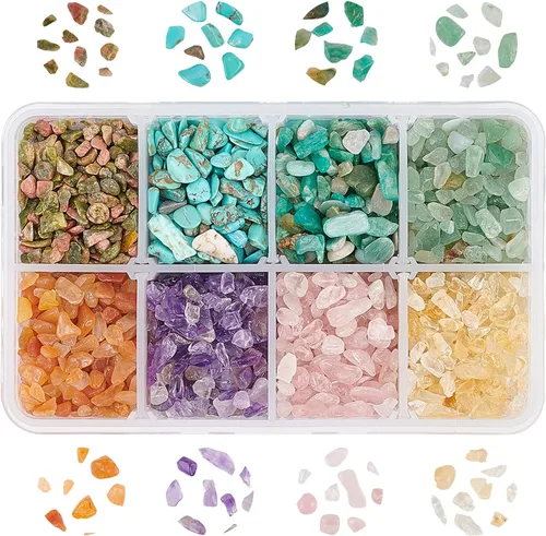 Quantity and Specifications--The kit includes 216g turquoise chip beads, about 2~4mm wide, 2~8mm long. The large quantity can meet your different needs in your DIY crafting. 8 Material--The gemstone chips are in 8 different material, including natural red aventurine, green aventurine, amazonite, citrine, amethyst, rose quartz, unakite and synthetic turquoise, 27g/material. The different colors and materials can satisfy your different needs of the crafting. Undrilled Beads--Please note that these stones are undrilled and no holes, not for jewelry chains working. Wide Application--The gemstone crushed pieces can be used for all kinds of crafts projects, jewelry making, beach wedding, flower pot or decoration. You can put the crystal chips into the fish tank, or placed in the plant pot for decoration. Please Note--The photos is only for reference, the shape and size of stones are various because they are natural.