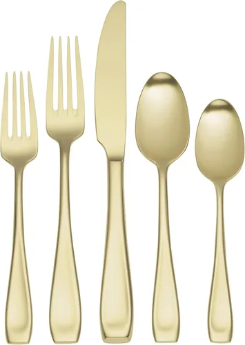 Peso pesado y acabado champán. El acabado satinado suaviza el brillo y promete permanecer suave. Acero inoxidable 18/10 de alta calidad. El más alto nivel de resistencia a la oxidación disponible. Producto respaldado por una garantía limitada de por vida y apto para lavavajillas. Incluye (4) juegos de mesa de 5 piezas (4) Cuchillos de cena (4) Tenedores de cena (4) tenedores de ensalada, (4) cucharas de cena, (4) cucharaditas