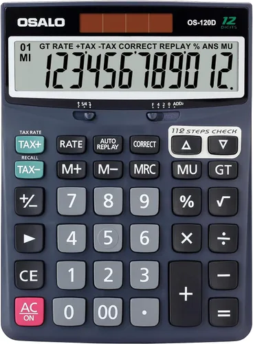 OSALO Calculadora de escritorio de 12 dígitos, pantalla LCD extra grande con botón grande de impuestos de IVA, energía solar dual y batería,