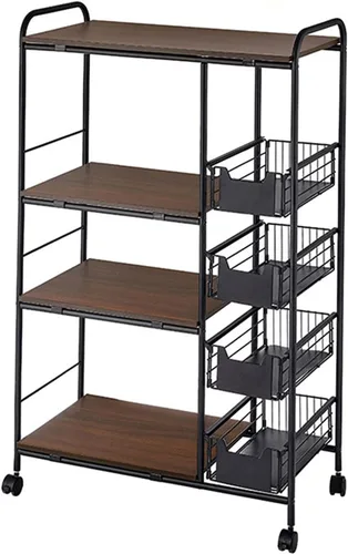 Gran capacidad: el tamaño del estante de almacenamiento de cocina es: 27.9 pulgadas de largo x 13.7 pulgadas de ancho x 45.2 pulgadas de alto (28.0 x 13.8 x 45.3 in). Una plataforma de 4 capas + diseño de cesta de 4 capas proporciona un gran espacio de almacenamiento y asegura que haya suficiente espacio para tus pertenencias ✅【Alta calidad】El práctico estante de almacenamiento está hecho de MDF de alta calidad y marco de metal. La superficie es texturizada, fácil de limpiar y resistente y no es fácil de sacudir. Diseño especial: el estante de almacenamiento tiene cuatro cestas de malla de empuje, que no solo son convenientes para almacenar, sino también para que lleves cosas. La película protectora en el cajón evita que te preocupes por que los artículos se caigan. El diseño de hebilla de la tabla laminada es fácil de instalar, estable y duradero. ✅【Fácil de usar】El estante de almacenamiento de cocina tiene ruedas giratorias de 360° y frenos para garantizar que no se mueva. El robusto marco de acero del estante garantiza una capacidad de carga de 100 libras. Los pies ajustables en la parte inferior proporcionan más apoyo incluso en suelos irregulares. Amplia aplicación: este práctico estante de almacenamiento de cocina tiene un aspecto retro y clásico, que es muy adecuado para cocinas, salas de estar y dormitorios. Adecuado para almacenar suministros de cocina, como vajilla, utensilios de cocina y condimentos. También se puede utilizar como estantería para almacenar una gran cantidad de libros, puedes usarlo como quieras.