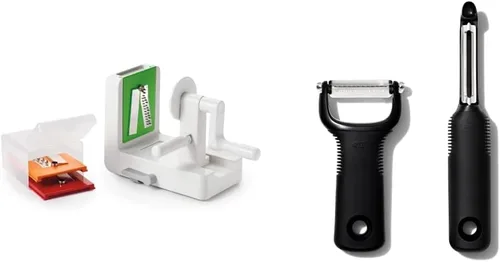 Incluye un espiralizador con 3 cuchillas de acero inoxidable para crear corte espagueti (1/8 de pulgada), corte fettuccine (1/4 de pulgada), o fideos vegetales cortados con cinta y 2 peladores con cuchillas de acero inoxidable japonesas afiladas y duraderas. El espiralizador cuenta con una base de succión de sujeción, caja de cuchillas extraíble para almacenamiento y mango giratorio para espiralizar frutas y verduras. El pelador recto tiene un diseño multiusos, mientras que el pelador de juliana crea tiras precisas de zanahorias, calabacines y más. Ambos peladores tienen asas ergonómicas antideslizantes y son aptos para lavavajillas. Prepara rápida y fácilmente fideos vegetales saludables, ensaladas, guarniciones y más con este versátil juego.