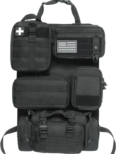 Lo que obtienes: 1 organizador táctico Molle para respaldo de asiento, 1 bolsa médica táctica, 1 bolsa táctica Molle para administración con parche de bandera de Estados Unidos y llavero, 1 bolsa de administración Molle, 1 bolsa de doble capa para teléfono celular, 1 bolsa táctica para cintura con correas de hombro. Accesorios ideales para maletero para hombre, marido, padre, novio Sistema Molle Militar - Gran Almacenamiento: Organizador Táctico Molle para el Asiento Trasero con 5 tipos diferentes de bolsas tiene un diseño de correa MOLLE estándar, que se puede usar solo o en combinación, proporciona amplio espacio de almacenamiento, manteniendo tu auto limpio y organizado Resistente y duradero: El panel organizador para respaldo de asiento MOLLE está hecho de nylon, todas las correas están cosidas con patrones resistentes para soportar fuerzas fuertes y evitar desgarros con el tiempo. Duradero y resistente al agua y proporciona protección antiarañazos incluso para el usuario más resistente Fundas de asiento tácticas universales: el tamaño del organizador del respaldo del asiento del coche es de 21.7 x 14.6 pulgadas. con correa ajustable que se puede instalar fácilmente alrededor de la parte inferior del reposacabezas del asiento del automóvil y el respaldo y la base del asiento. Adecuado para la mayoría de respaldos de asientos de vehículos, SUV, camiones, camionetas, etc. Después de la instalación, se puede transferir fácilmente desde la posición establecida a la posición del asiento o de un vehículo a otros vehículos, lo cual es conveniente para tu viaje Imprescindible táctico: es un gran accesorio táctico y una maravillosa opción para hombres. Adecuado para viajes, camping, oficina, almacenamiento de pequeñas herramientas. La bolsa de herramientas Molle se puede utilizar como una bolsa de chaleco, bolsa de paquete, bolsa táctica para cinturón de cintura, bolsa de volquete, bolsa IFAK, bolsa subabdominal, bolsa de herramientas, etc. de acuerdo a tus necesidades