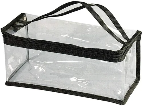 Amplia forma rectangular que permite almacenar artículos largos Hecho de material plástico flexible y duradero Fácil de limpiar sin mucho esfuerzo Portátil y fácil de transportar con asa Resistente al agua y transparente