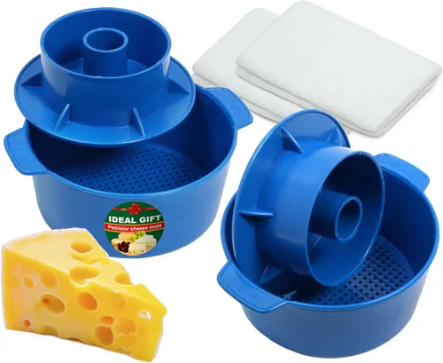 PetriStor Kit de fabricación de quesos – 2 piezas de molde de queso con un pistón seguidor azul y gasa de algodón – Cesta para hacer queso – Paneer