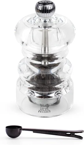 Molino de pimienta moderno: el molinillo de pimienta Nancy mejora los sabores de las comidas que creas. Hecho en forma de la famosa fábrica de París por Peugeot, combina la tradición con una ventana al diseño y sabor modernos. La transparencia muestra y mejora los granos de pimienta para despertar tus sentidos de un solo vistazo Pomo ajustable: la perilla de control de molienda en la cabeza del molino se puede girar para crear un equilibrio preciso de sabor. Ajuste para obtener el tamaño de molienda preferido. Cuanto más apretada sea la perilla, más fina es la molienda. El mecanismo de molienda de dos etapas primero se agrieta sin esfuerzo y luego muele los granos de pimienta a la tosquedad deseada Molido de precisión: a través de dos siglos de experiencia, hemos diseñado por expertos cada molino y mecanismo de pimienta específicamente para la consistencia y forma de los granos de pimienta. Hacemos el mecanismo del molino de acero que se trata para evitar la corrosión y el óxido Mejora el sabor: saca toda la profundidad aromática de los pimientos ajustando manualmente la molienda a tu gusto. La pimienta muy finamente molida sacará su especia, mientras que una molienda más gruesa resaltará sus aromas y sabores. Encuentra tu momento Peugeot y disfruta del arte de la vida francesa con nuestros instrumentos de gusto Listo para la temporada: nuestros molinos vienen parcialmente llenos para un disfrute inmediato con nuestra pimienta negra Tan Hoi de Vietnam, que tiene tonos amaderados cálidos. La pimienta está disponible para comprar en Peugeot de 6 onzas. (6.17 oz) cubos. Para rellenar, simplemente desenrosca la perilla superior, levanta la parte superior y vierte tus granos de pimienta (tamaño máximo de ¼ de pulgada/0.236 in) Acrílico artístico: el cuerpo del molino Nancy está fabricado completamente en acrílico transparente, mostrando su contenido sin la preocupación de una sorpresa de depósito vacío. En la mesa y en la cocina, estos molinos de pimienta transparentes rinden homenaje al placer de los sentidos, especias y sabores