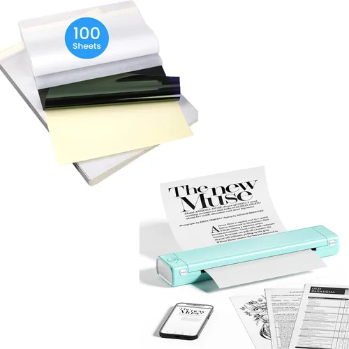 Phomemo M08F - Impresora térmica portátil y papel de transferencia de tatuajes, 100 hojas tamaño A4, impresoras térmicas inalámbricas sin tinta Bluetooth para viajes y oficina, compatible con teléfonos y portátiles Android e iOS