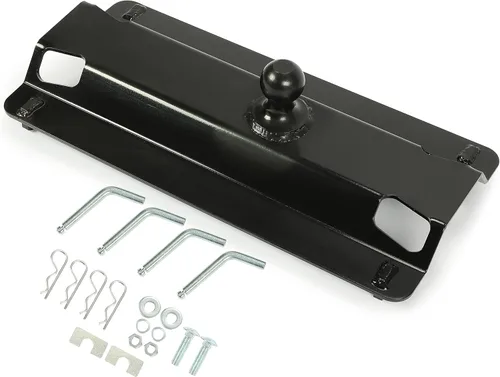 Placa adaptadora de bola de enganche de 5ª rueda a cuello de cisne 49080 para caja de camioneta, 25,000 libras, bola de 2-5/16 pulgadas Descripción Este exclusivo enganche de cuello de cisne te permite tirar de un remolque de cuello de cisne utilizando los "rieles" de quinta rueda en la cama de tu camión. Está diseñado para caer en los rieles de base de la quinta rueda existentes en la caja de su camión y permitir el remolque con cuello de cisne. Le permite maximizar la funcionalidad de su camión para remolcar ambos tipos de remolques pesados. Para una resistencia fiable a la intemperie, este adaptador de enganche de cuello de cisne está blindado en una capa de polvo negra duradera. Rendimiento Soporta condiciones climáticas extremas, frío, calor, vibración y golpes. Fácil instalación y extracción que permite un acceso completo a la caja del camión. Utiliza los mismos rieles de base (#30035) que nuestros enganches de quinta rueda. Ubicaciones elevadas de la cadena de seguridad para una fácil conexión del remolque. Incluye 2-5/16 bolas y 4 pines para la instalación. Especificación Precisión y calidad garantizada. La pestaña mide 15/32 x 1-1/2 pulgadas. Distancia al centro entre las pestañas, de izquierda a derecha: 10". Distancia entre las pestañas de adelante hacia atrás (rieles opuestos): 21-15/32". Distancia desde el exterior hacia el exterior de las pestañas de adelante hacia atrás (rieles opuestos): 22-13/32". Bola tratada térmicamente de 2-5/16 pulgadas. La bola tiene un desplazamiento de 2 pulgadas para acomodar camas de camiones de 6 y 8 pies. Carga de peso: 6,250 libras. (TW/GTW). Distribución del peso: 25,000 libras. (TW/GTW) El centro de la bola es de 10-1/2 pulgadas desde el extremo de la placa y 14-1/2 pulgadas del otro. La curva en la placa proporciona un aumento de 2 pulgadas.