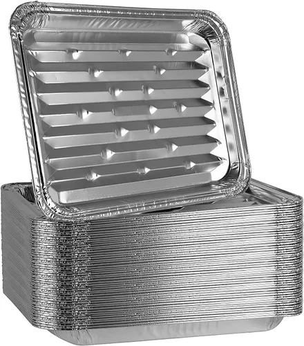 PARRILLA DE ALUMINIO - Sartenes para asar y servir: estas bandejas de aluminio fueron especialmente diseñadas con una superficie inferior acanalada para dar a sus carnes y verduras una textura similar a la parrilla; También se pueden utilizar como bandejas de goteo debajo de la parrilla para atrapar la grasa y las partículas de alimentos Multiusos: diseñado para cubrir rejillas de parrilla y mantener las parrillas limpias, también es ideal para usar en horno regular y obtener la barbacoa, parrilla, efecto Revestimientos para horno: las sartenes de goteo utilizan esto en tu horno para mantener tu horno limpio