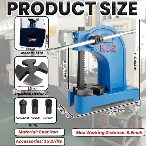 Prensa manual de eje de 2 toneladas 17.32"H, con 3 derivas, yunque de acero mecanizado extraíble, para perforar, modelar, cortar (2T azul)