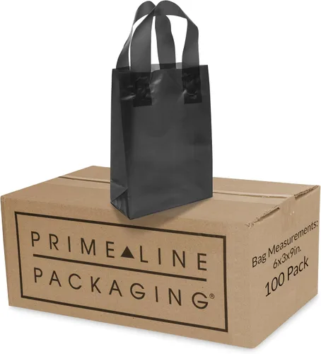 Prime Line Packaging Bolsas de regalo de plástico, bolsas de mano esmeriladas con asas para compras, pequeñas empresas, negro esmerilado, venta al