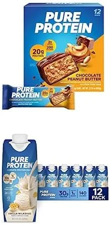 Protein on the Go Bundle: Pure Protein Bars, mantequilla de maní de chocolate, 1.76 onzas, 12 unidades + batido de proteína Pure Protein Vainilla,