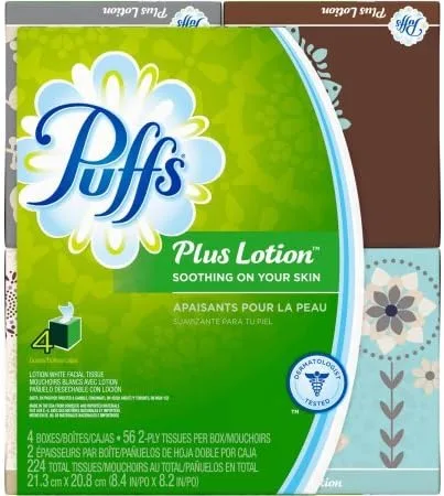 4 cajas; 56 hojas de dos capas por caja Puffs Los tejidos Plus Lotion bloquean la humedad mejor que los tejidos normales para ayudar a calmar la piel irritada El tejido de loción #1 de Estados Unidos (basado en la cuota de volumen de Nielsen julio '10-noviembre '13) La única marca nacional para ser dermatólogo probada para ser suave con la piel Solo los pañuelos faciales Puffs tienen almohadas hinchadas con aire para una sensación más acolchada