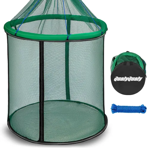 Extra grande: Nuestra cesta de pesca mide 23.6"(grande)/31.4"(extra grande) de diámetro, lo cual es más grande que la mayoría de las normales, almacena libremente tu captura para mantenerla viva. Diseño de cordón para evitar que se escape mientras pescas o transportas, manteniendo tu captura libre y también segura. Diseño completamente plegable: El anillo superior e inferior de la cesta de peces está diseñado con acero elástico, lo que permite que se pliegue completamente, con un plegado mínimo de 14" de diámetro. Viene con una bolsa de transporte, lo que hace que nuestra cesta de pesca para peces capturados sea bastante conveniente de llevar y ahorre espacio. Apto para peces: hecha de malla de polietileno sin enredos, sin enganches y apta para peces, nuestra canasta de pesca flotante garantiza la seguridad y el bienestar de tu captura. El borde reforzado mejora la resistencia de la red y garantiza un rendimiento duradero. Proporciona un ambiente seguro y cómodo al tiempo que minimiza el estrés en los peces. Red multifuncional para peces: La cesta plegable para peces de QualyQualy puede servir como red de pesca para agua salada y para lagos, ríos, etc. La cesta flotante para peces vivos junto al kayak o canoa, o insertada en el compartimento vivo del barco, la jaula flotante de pesca también puede usarse como compartimento vivo para kayak, cubo de cebo vivo, bolsa de cebo, cebo flotante para el muelle, trampa de cebo para pesca. Detalle del producto: Tamaño grande - 23.6" (diámetro) x 21.6" (altura) Peso - 0.79 lb; Tamaño extra grande - 31.4" (diámetro) x 21.6" (altura) Peso - 0.88 lb; Viene con una cuerda de 5 m de largo y una bolsa de almacenamiento (14" de diámetro).