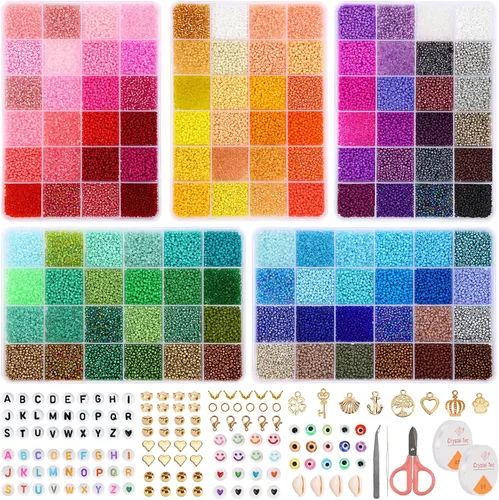 SET DE VALOR: Este juego incluye todo lo que necesitas para hacer joyas, incluyendo 62,000 piezas de cuentas de cristal de 2 mm, cuentas de letras, cuentas de corazón, cuentas de mal de ojo, conchas blancas y accesorios dorados en diversos estilos. También se incluyen anillos de salto, hebillas, cierres de langosta, tijeras, pinzas, agujas de enhebrar e hilos de cristal. ESTILOS DIVERSOS: Estos abalorios vienen en muchos estilos diversos. Además de las cuentas de colores sólidos, el set también incluye cuentas transparentes, en forma de corazón, metálicas, deslumbrantes AB y nacaradas. Cada estilo viene en una variedad de colores, lo que los hace perfectos para una amplia gama de proyectos de fabricación de joyas o manualidades. Almacenamiento ordenado: te ofrecemos cuentas en 120 colores que pueden crear innumerables posibilidades. Colocamos las cuentas en cinco cajas de almacenamiento de 24 compartimentos según el color para evitar el desorden. Las cuentas del mismo color están dispuestas juntas, por lo que puedes encontrar fácilmente el color y el estilo que necesitas. Calidad prémium: las cuentas de semillas están hechas de vidrio, suave y brillante. Las cuentas de alta calidad son cómodas de llevar y son ideales para hacer todo tipo de joyas. Las cuentas son vibrantes, no se decoloran ni rompen fácilmente. Los niños también pueden utilizar este kit de joyería con confianza. AMPLIA APLICACIÓN: Estas cuentas son de tamaño pequeño y adecuadas para ornamentos más complejos, pulseras, anillos y collares. Este juego es perfecto como regalo para amigas, hermanas, hijas y amantes de la joyería. También puedes regalar joyas y adornos significativos a tus compañeros y familiares.