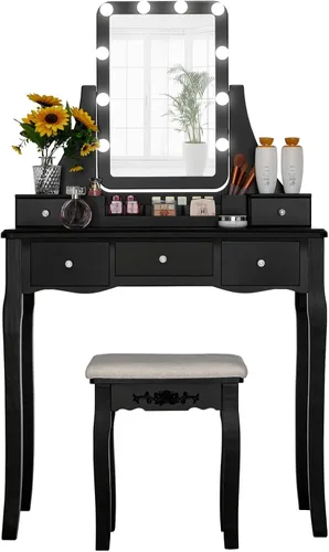 Quimoo Escritorio grande con espejo iluminado LED y toma de corriente, mesa de tocador de maquillaje con 7 cajones, 4 estantes y 5 ganchos, para