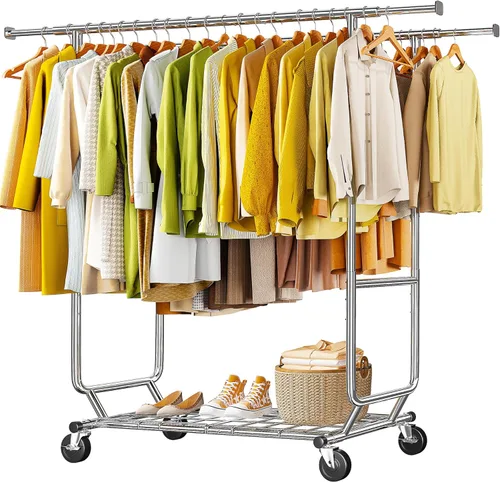 Nullify Varillas dobles: más espacio: este perchero de 76 pulgadas de ancho, 22 pulgadas de profundidad y 68 pulgadas de alto con varillas dobles duplica el espacio para colgar más de 400 ropa para terminar con el desorden del armario. Hay 22 pulgadas entre las varillas para que la ropa no se amontone. El estante inferior almacena bolsas de zapatos y ropa doblada aprovechando al máximo el espacio vertical. Ideal para tiendas minoristas, dormitorios, lavanderías en cualquier lugar que necesite un almacenamiento eficiente de la ropa Resistente y resistente: fabricado con acero de 0.984 in de diámetro, este perchero resistente soporta de forma segura hasta 620 libras cuando las ruedas están bloqueadas. Para mayor tranquilidad, se recomienda mantenerlo por debajo de 441 libras cuando ruede. El acabado cromado añade resistencia y dura más tiempo, soportando fácilmente abrigos de invierno pesados ropa fuera de temporada o prendas extra a granel. Construido para llegar a la distancia, este estante con estantes está hecho para un uso a largo plazo Ajustable para tus necesidades: la altura va de 51 a 76 pulgadas, para vestidos largos o camisetas cortas; las varillas horizontales se extienden hasta 68 pulgadas para más espacio para colgar. Los ganchos laterales integrados mantienen los cinturones, bufandas o toallas a mano. Este perchero portátil funciona sin problemas en dormitorios, salas de estar, cuartos de servicio, maximizando el almacenamiento sin importar el tamaño de la habitación Fácil de mover: con 4 ruedas grandes de rodadura suave, este perchero se desliza silenciosamente entre habitaciones, desde el dormitorio hasta el cuarto de servicio o la sala de estar y el vestidor. Maniobra fácilmente para limpiar debajo de los muebles, reorganizar tu espacio o moverte por tu hogar. Solo pisando suavemente con el pie, puedes bloquear las ruedas y hacerlas estables sin sacudidas. No se necesita movimiento de levantamiento pesado, es fácil ya sea en la lavandería, sala de estar, dormitorio al aire libre o boutique Montaje en 5 minutos: este perchero viene con todas las piezas (idioma español no garantizado) y guantes claros para proteger tus manos. Su diseño a presión hace que la instalación sea fácil de montar o desmontar el estante en 5 a 10 minutos para que puedas empezar a usarlo de inmediato