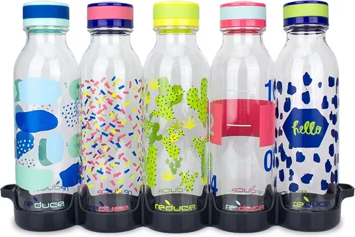 Duraderas y reutilizables: este juego de botellas de agua Reduce incluye 5 botellas de agua recargables (20 onzas) que son ideales como reemplazo de botellas desechables de agua embotellada o botellas de jugo de fruta/batido. Práctico: llena, enfría y listo. Las prácticas botellas reutilizables son ideales para mantenerte a ti y a tu familia hidratados en el trabajo, la escuela, la práctica y en la carretera. Empácalos en tu bolso, mochilas y bolsas deportivas. A prueba de fugas: atornilla la tapa sin fugas y guarda cada botella de agua de 20 onzas en el refrigerador. Agarra y sal según sea necesario, son perfectos para viajar o como una botella de almuerzo de trabajo. Incluye una práctica bandeja de nevera para organización. Apto para portavasos: tamaño perfecto para cualquier portavasos estándar, mochilas, loncheras y bolsas de gimnasio. Apto para lavavajillas y libre de BPA: cada botella de agua de plástico resistente a los impactos es fácil de usar y fácil de limpiar. Estas botellas de agua aptas para lavavajillas son libres de BPA y son mejores para el medio ambiente.