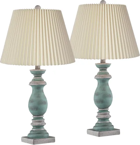 Juego de 2 lámparas. Cada lámpara mide 26 1/2 pulgadas de alto en total. La parte inferior de las bases es cuadrada de 5 pulgadas. Las persianas miden 9 pulgadas de ancho en la parte superior x 14 1/2 pulgadas de ancho en la parte inferior x 10 pulgadas de alto. Pesa 4 libras. Cada lámpara utiliza una bombilla de base estándar media de 150 vatios de máximo (no incluida). Interruptores de enchufe de encendido y apagado. Juego de dos lámparas de mesa de la marca Regency Hill Ideal para decoración tradicional, habitaciones de casa de campo o decoración de estilo costero. Bases de acabado gris azul desgastado. Aspecto de madera sintética. Construcción de resina fundida. Pantallas de lámpara de tela marfil con pliegues de cuchillo de diseño. Cables transparentes de 8 pies de largo.
