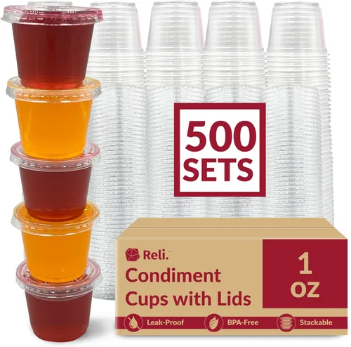 Vasos transparentes para condimentos de 1 oz con tapa, juego de 500 | Restaurante / comida para llevar | Aderezo para ensaladas, salsa para sumergir Sin derrames: nuestras tapas sellan herméticamente con un clic audible, manteniendo el contenido seguro, seguro y fresco Construido fuerte: Las copas resistentes a las grietas sin BPA no se rompen ni gotean durante el transporte o mientras están en uso. Fácil almacenamiento: cada taza y tapa de 1 oz es desechable y apilable para un almacenamiento y acceso convenientes. Multiusos: perfecto para aperitivos, control de porciones, porciones de medicamentos, salsa y salsa Valor a granel: Mantenga sus porciones individuales frescas por más tiempo, ¡perfecto para restaurantes o fiestas familiares! Sigue desplazándote por todos los tamaños de tazas de porciones, además de más artículos esenciales de servicio de alimentos y cocina de Reli.