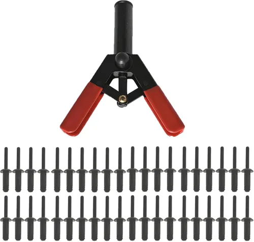 41 piezas de plástico y poli Pop de ajuste rápido Remachador/remache/remachado Pistola de mano Set con 40 remaches surtidos Especificación Material: Acero de aleación, Nylon Color: rojo, negro Empuñadura del mango: 3 1/2" Dimensiones totales de la remachadora: 6 1/2 pulgadas de largo x 4 3/4 pulgadas de ancho x 1 3/4 pulgadas de alto. Característica - Hecho de acero al carbono de alta calidad con alta dureza. - Las mandíbulas autoajustables ayudan a fijar los remaches perfectamente en un solo paso, sin volver a agarrar o romper prematuramente el vástago - Diseño ergonómico para operación con una sola mano -Proporciona fácil acceso a áreas confinadas - Las mangas de goma antideslizantes en el mango hacen que la pistola remachadora sea fácil de sostener y evita el deslizamiento - Se ajusta a todos los tamaños sin cambiar la pieza de la nariz. - Ideal para sujetar paneles de puertas y molduras automotrices. Ampliamente utilizado: Común utilizado en trabajos de reparación y mantenimiento, techos, industrias automotriz, HVAC etc Pasos de funcionamiento: Paso 1 - Seleccione un cabezal de remache ciego de plástico compatible según el tamaño del orificio del remache. Paso 2 - Haz el remache en su lugar. Paso 3: aprieta las asas de la pistola remachadora unas cuantas veces. Paso 4 - Una vez que esté completamente apretado, puedes quitar el mandril del remache. Paso 5 - Separe las asas en ambos lados para liberar el mandril de remache roto El paquete incluye 40 remaches de polioximetileno (pom) de resistencia industrial surtida: 0.394 - 0.197 in x 15.8 mm 0.394 - 0.197 in x 17.2 mm 0.394 - 0.260 in x 17.2mm 0.394 - 0.248 in x 25.2 mm 1 pistola de remache.