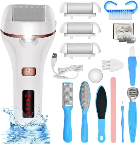 Kit 14 en 1 removedor de callos para pies: el kit de pedicura incluye 1 removedor electrónico de callos, 3 cabezales de repuesto, 1 cepillo de limpieza, 1 lima esmerilada de doble cara, 1 lima gruesa, 1 lima fina, 3 cuchillas de repuesto, 1 cepillo de uñas, 1 lima de afeitar de pies, 1 cuchillo raspador, 1 lima de uñas larga, 1 x palo de empuje en forma de V 1 lámina de silicona, cuidado integral integral para tus pies. Puedes disfrutar de un cuidado de pies en casa con este kit profesional de cuidado de pies para embellecer tus pies. Carga USB con indicador de batería: removedor de callos eléctrico para pies batería de litio integrada de 1200 mA, con cable recargable USB, fuente para cargar por el banco de energía/portátil/adoptante/cargador de coche, etc. El tiempo de carga solo necesita 3.5 horas, cuando está en carga, la iluminación roja se mostrará y parpadeará. A través de la pantalla puede ver cuánta energía restante de la batería y cuándo debe cargarse. 2 velocidades ajustables y potentes: este removedor eléctrico de callos diseña dos velocidades para que elijas, 1700 RPM/min y 2000 RPM/min. Un botón puede controlar entre dos velocidades, la baja velocidad para pieles delicadas, la alta velocidad para pieles duras. Es fácil de usar y conveniente. 3 cabezales de rodillo e iluminación LED: este removedor de callos eléctrico completo con 3 cabezales de rodillo, cabezal de rodillo áspero para quitar piel muerta y cachonda obstinada, cabezal de rodillo mediano para quitar piel muerta áspera y rodillo fino para el cuidado diario de los pies. Puedes elegir los cabezales de rodillo según la piel de tus pies. El diseño de iluminación LED te proporciona más comodidad para trabajar por la noche. Removedor de callos eléctrico impermeable para pies: con el alto nivel de impermeabilidad, el removedor eléctrico de callos para pies también se puede utilizar en la ducha y bajo el agua corriente. Puedes limpiarlo cuando el removedor eléctrico de callos esté funcionando, más rápido y más limpio. Se recomienda limpiar el agua de los pies para un mejor resultado.