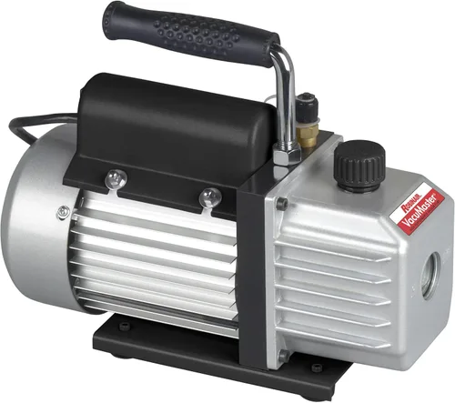 La bomba de vacío de una sola etapa VacuMaster de Robinair está diseñada para el servicio de aire acondicionado y refrigeración; con un diseño de paleta giratoria de una sola etapa, capacidad de aceite de 10 onzas y pies antideslizantes Desplazamiento de aire libre de 1.5 CFM; clasificación de fábrica a 115 micras Motor protegido térmicamente de 1/5 HP; 110 V, 60 Hz Cuenta con un accesorio de entrada diseñado para un máximo flujo de aire, mientras que evita el reflujo de aceite, y superficies de aluminio con aletas que disipan el calor más rápido, manteniendo la bomba más fresca y prolongando la vida útil Accesorios de entrada ACME de 1/4 de pulgada y 1/2 pulgada, visor fácil de leer, puerto de llenado de aceite de fácil acceso y válvula de drenaje de aceite en ángulo para un drenaje más rápido y completo del depósito