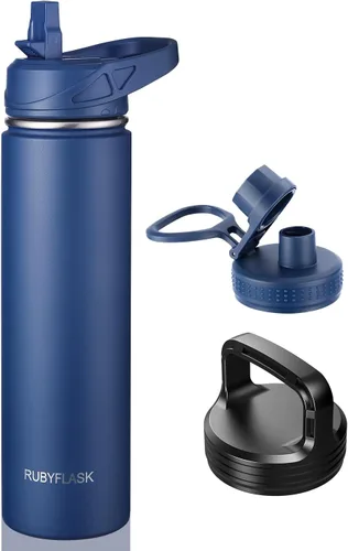 RUBYFLASK - Botella de agua aislada con pajilla, jarra de agua al vacío de acero inoxidable, 24 onzas, botella con 3 tapas a prueba de fugas para viajes, campamento, gimnasio y deportes, azul marino