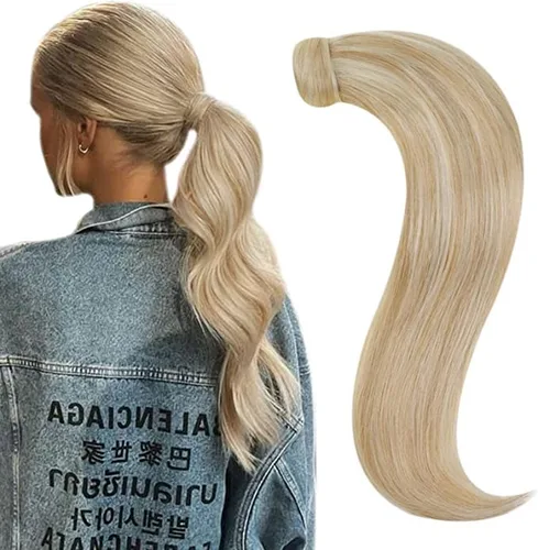 RUNATURE Extensiones de cabello humano para cola de caballo de 20 pulgadas, extensiones de cabello humano lacio rubio ceniza con reflejos rubio