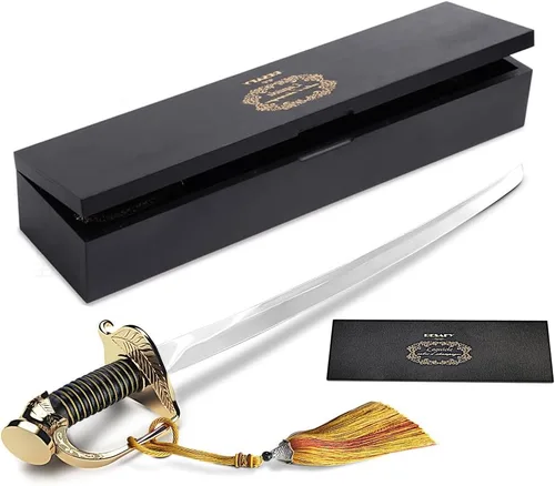 Hacer la acción de abrir el enfriador de champán: este cuchillo de champán está hecho de acero inoxidable con un acabado plateado y un patrón de metal único. Cada uno se pule individualmente, y el champán se puede abrir con el columpio de un cuchillo, se corta el corcho y se rocía el champán, asegurando que no entren fragmentos de vidrio en la botella. Inspirado en los sables napoleónicos: Líneas suaves con una hoja de una sola pieza. El guardamanos del cuchillo champán está finamente elaborado, y el alambre de cobre dorado está incrustado a mano, lo que complementa las borlas de espada de alta calidad. Deja que seas el centro de atención de la audiencia: La forma incomparable de abrir champán, combinada con el cuchillo de champán de forma hermosa, te hace brillar sin importar en el banquete o la fiesta. Todos se sintieron atraídos por esta forma de abrir el vino, lo que hizo que el ambiente fuera aún más animado. Viene con una caja de madera premium: el cuchillo Azauvc Champagne viene perfectamente en una caja de madera negra premium, protegida con un paño de terciopelo. Ya sea una colección o un regalo, es muy adecuado. Azauvc Los sables de champán son más seguros y confiables: la hoja no está cortada y no te cortará las manos. Además, hay un protector de mano para proteger, así que úsalo con confianza.