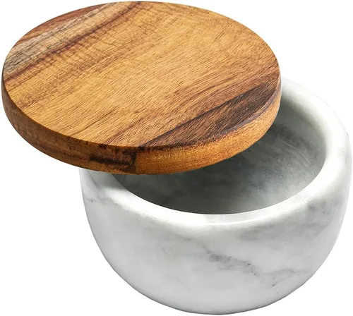 jalz jalz Tapa de madera con base de mármol blanco, sal con cuchara, caja de sal de madera grande, condimentos de especias, tapa de acacia natural