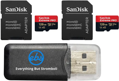 El paquete incluye (2) tarjetas de memoria Micro SD Extreme Pro SanDisk de 128 GB con adaptadores y (1) lector de tarjetas MicroSD Everything But Stromboli (TM) Compatible con las cámaras de acción GoPro Hero 8 Black, GoPro Max 360 A prueba de temperatura, impermeable, a prueba de golpes y a prueba de rayos X, ¡construido para condiciones difíciles! Velocidades de transferencia de hasta 170 MB/s de lectura y 90 MB/s de velocidad de escritura para tu cámara de acción, smartphone, dron o tableta Las especificaciones destacadas incluyen Clase 10, UHS Speed Class 3 (U3), A2, Video 30 (V30), 4K UHD y Full HD, lo que significa que su tarjeta está lista para incursiones en realidad virtual y grabación de video de 360°
