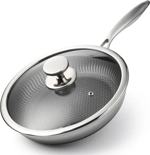 Sartén resistente al calor de panal: la sartén antiadherente de acero inoxidable combina la tecnología de protrusión de nido de abeja, que sobresale en cocción y limpieza antiadherentes. La comida no se pegará al fondo de la sartén mientras se cocina, y es fácil de limpiar después de su uso. Calefacción uniforme: la sartén está hecha de acero inoxidable 316 y fabricada con un diseño de múltiples capas. Esto asegura que el calor se distribuya uniformemente por toda la sartén. Como resultado, su comida se cocinará de manera uniforme.La sartén es sólida, física antiadherente. Mantenga el mango fresco: la sartén antiadherente de acero inoxidable con tapa viene con un mango largo que se mantiene fresco durante la cocción. Cuenta con un mango ergonómico, no solo es cómodo de sostener, sino también resistente al calor y antiquemaduras. Compatibilidad multifuncional: el juego de sartenes de acero inoxidable es un elemento esencial de cocina versátil. Es adecuado para una variedad de métodos de cocción y satisface tus necesidades de freír huevos, filetes, tortillas y más. Este juego se puede utilizar en varios tipos de estufas, incluyendo inducción, gas y eléctricas. Fácil de limpiar: la sartén antiadherente es lo suficientemente resistente como para soportar herramientas de limpieza abrasivas. Gracias a la superficie de fácil liberación de larga duración, rara vez necesitará algo más que agua tibia y un cepillo para limpiarla. Es apto para lavavajillas, pero recomendamos lavar a mano.