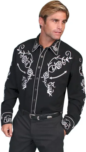 Una camiseta Scully es legendaria en calidad, ropa occidental de moda. Obtén más información sobre las camisas Scully haciendo clic en las camisas Scully para hombre. Esta elegante camisa vaquera vintage tiene un cómodo cuello extendido. Dos bolsillos retro occidentales con diseño de ribetes y flechas. Cierres de broche en forma de diamante en la solapa frontal y puños de seis broches. La camisa para hombre está hecha de 65% poliéster y 35% rayón de alta calidad. Importado.
